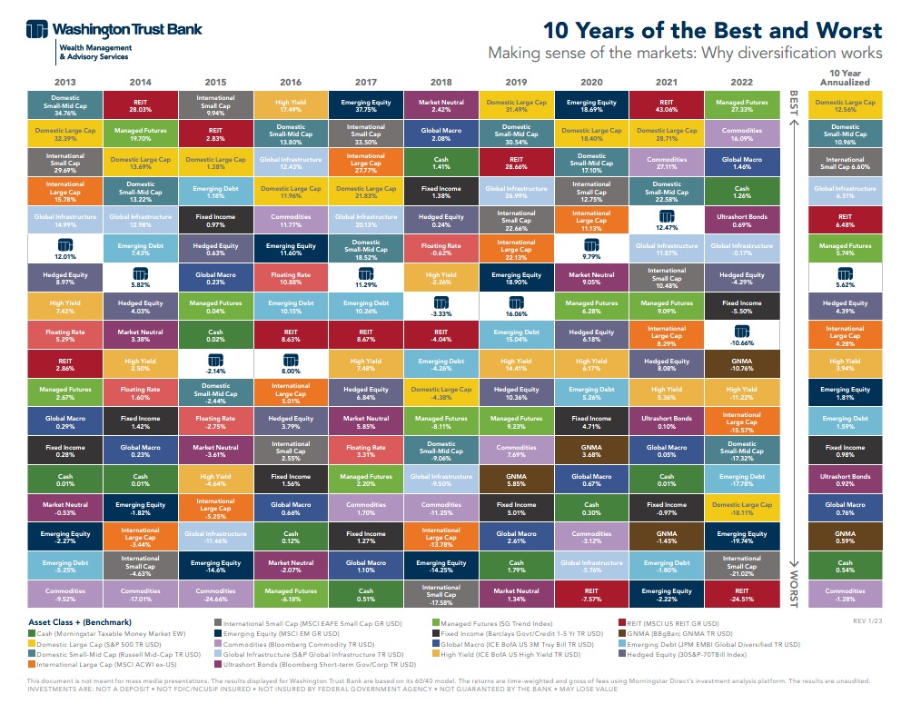 Diversification serves as the stabilizing ballast for your investment journey. Research has demonstrated the best approach is to diversify your investments across different asset classes. It reduces portfolio risk, enhances stability, and keeps your boat from capsizing. During market stress, certain sectors may face headwinds while others outperform with the wind filling their sails. We illustrate the importance and benefit of this “ballast” of diversification using this chart, which shows various asset classes’ performance over 10 years compared to a diversified 60% equity and 40% fixed income portfolio.